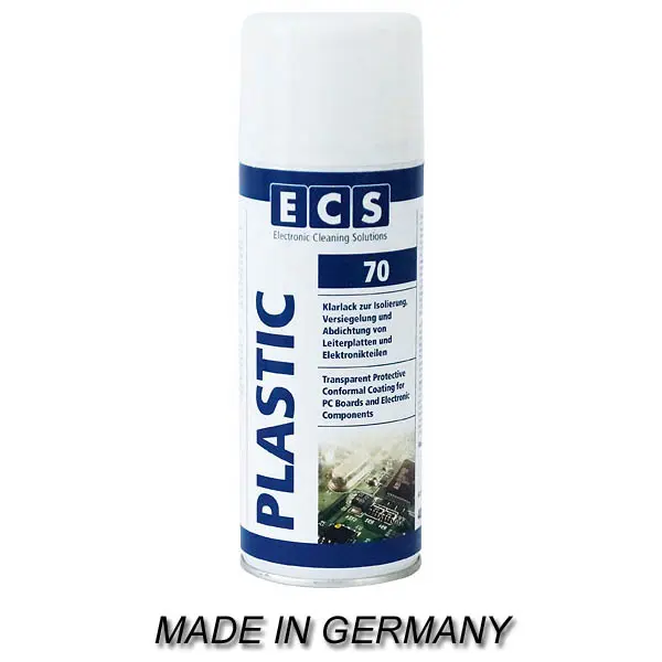 بلاستيك سبراي (صنع في ألمانيا) يعتمد على راتنج أكريليك مناسب بشكل خاص للصناعة الإلكترونية. فهو يشكل طبقة لامعة ومرنة و واقية مقاومة للأحماض والملح والفطريات و الأبخرة الأكلة ، الإجهاد الحراري ،وإساءة الاستخدامات الميكانيكية ، القلويات والكحوليات والرطوبة والبيئية القاسية يحتفظ بفعاليته داخل نطاق واسع تتراوح درجات الحرارة من -70 درجة مئوية إلى + 120 درجة مئوية حيث يلتصق الاسبراي بمواد مختلفة مثل المعدن ،البلاستيك ، والخشب ، والكرتون ، والزجاج ، إلخ